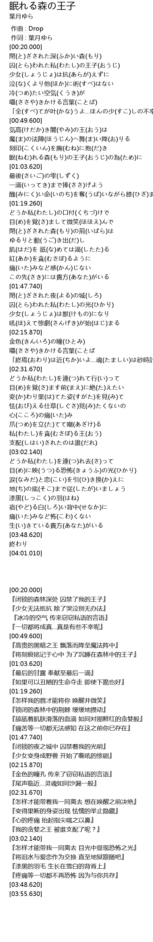 | [00:21.680] | 閉(と)ざされた深(ふか)い森(もり) 囚(とら)われた私(わたし)の王子(おうじ) |