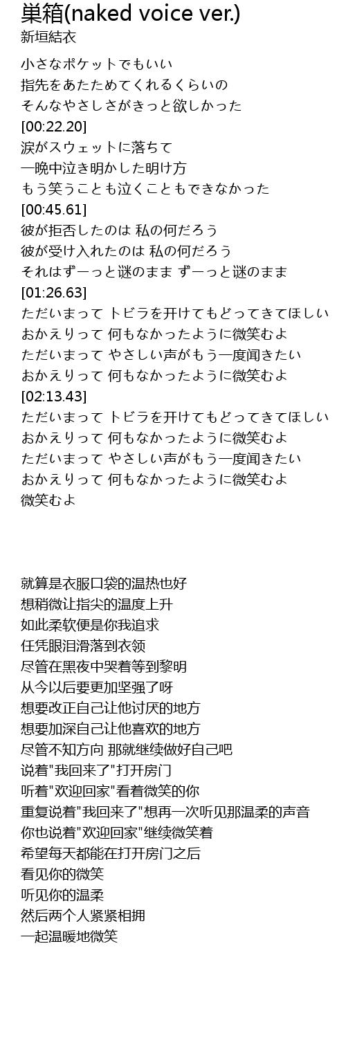 | [02:16.81] | ただいまって トビラを开けてもどってきてほしい |