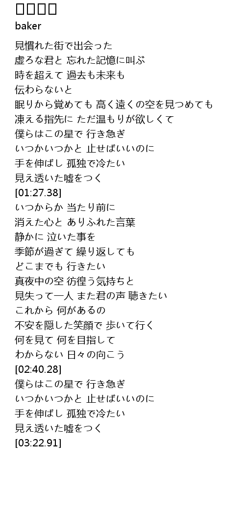 | [02:58.34] | 僕らはこの星で 行き急ぎ |