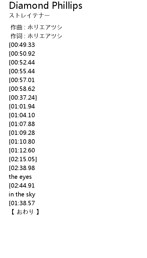 | [02:51.13][02:38.98][02:27.02][01:25.63][01:13.84] | I follow you with diamonds in the eyes |