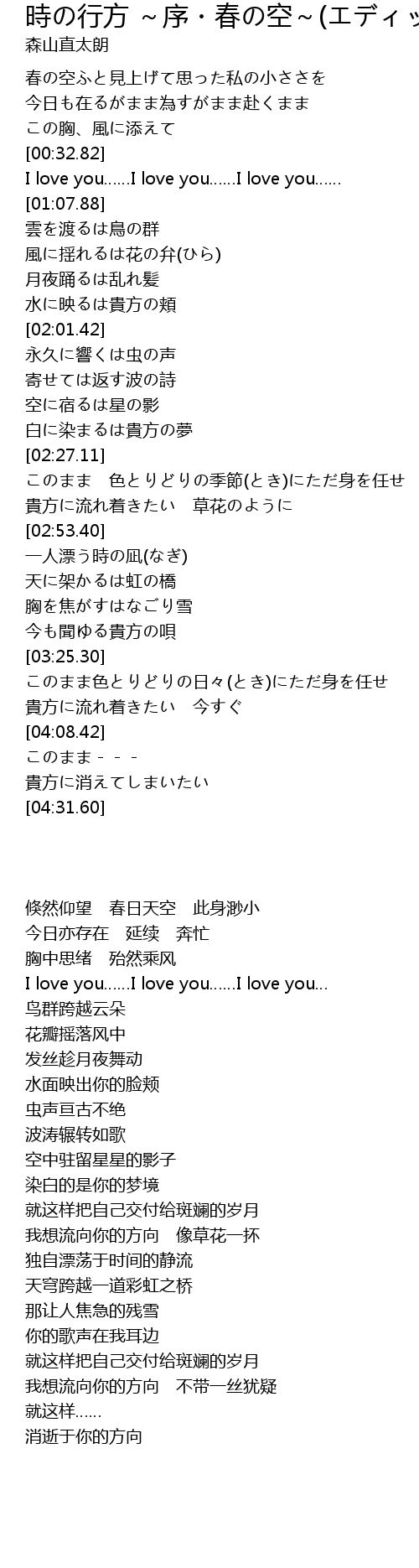| [00:00.53] | 春の空ふと見上げて思った私の小ささを |