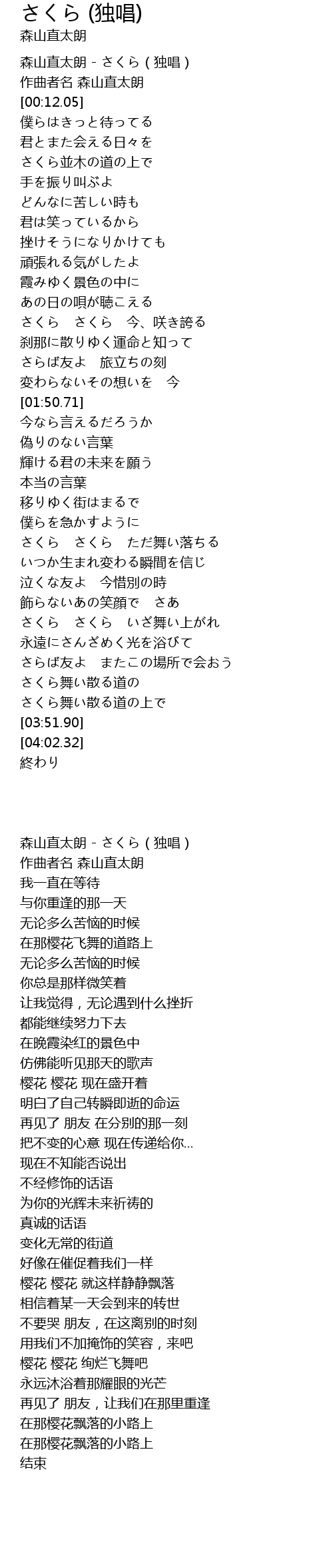 | [00:00.00] | 森山直太朗 - さくら(独唱) |