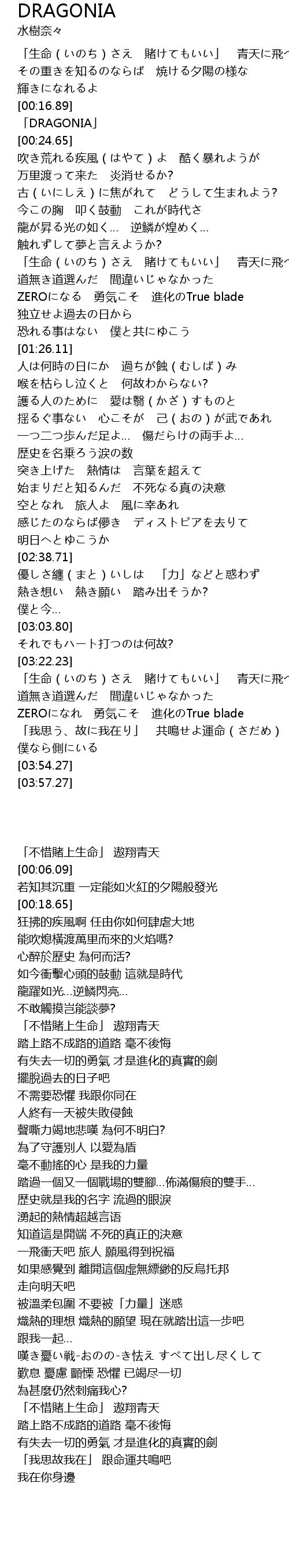 | [03:35.54] | ZEROになれ 勇気こそ 進化のTrue blade |