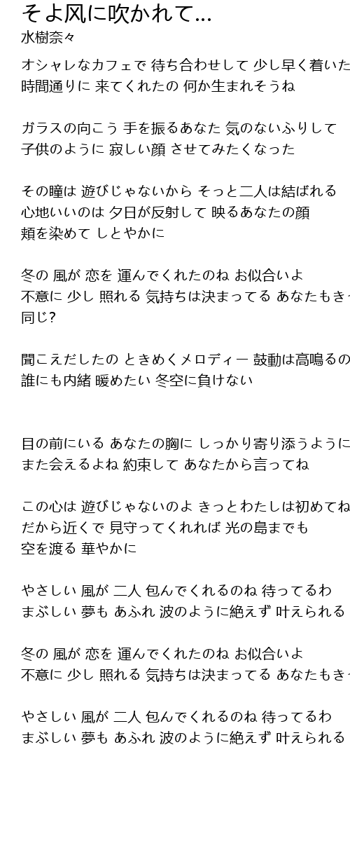 | やさしい 風が 二人 包んでくれるのね 待ってるわ | |