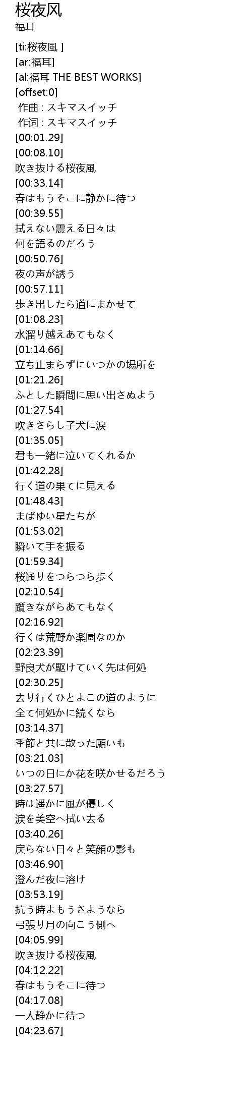 | [04:07.13] | 吹き抜ける桜夜風 |