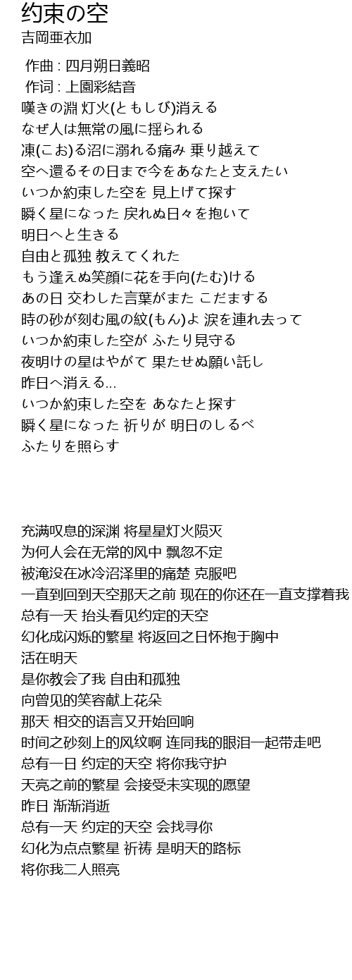 | [03:35.67] | いつか約束した空を あなたと探す |