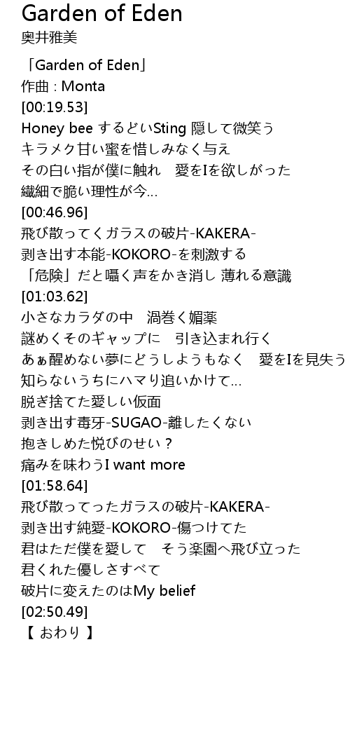 | [00:21.53] | Honey bee するどいSting 隠して微笑う |