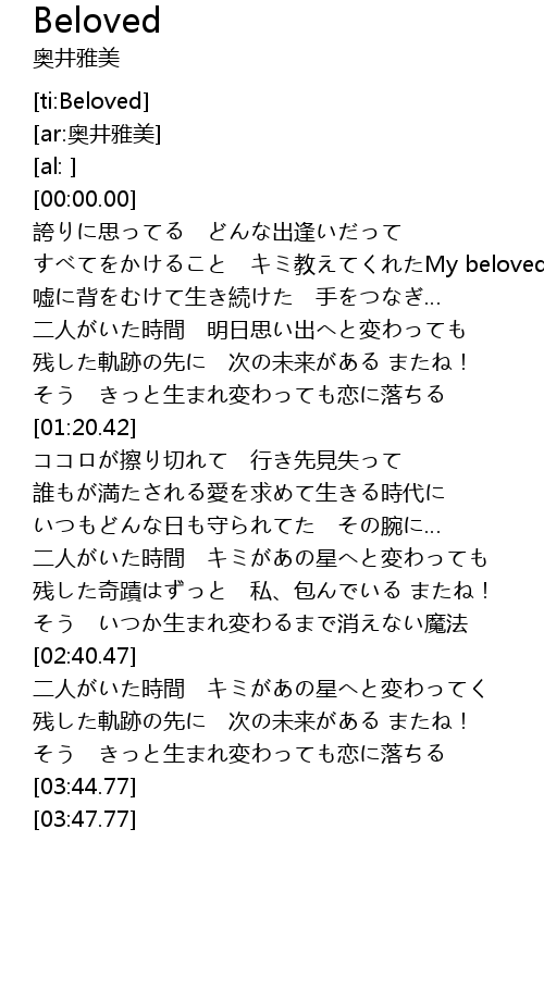 | [00:20.78] | すべてをかけること キミ教えてくれたMy beloved |