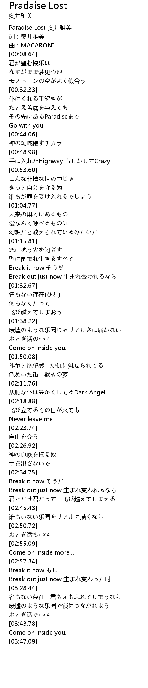 | [00:02.03] | Paradise Lost-奥井雅美 |