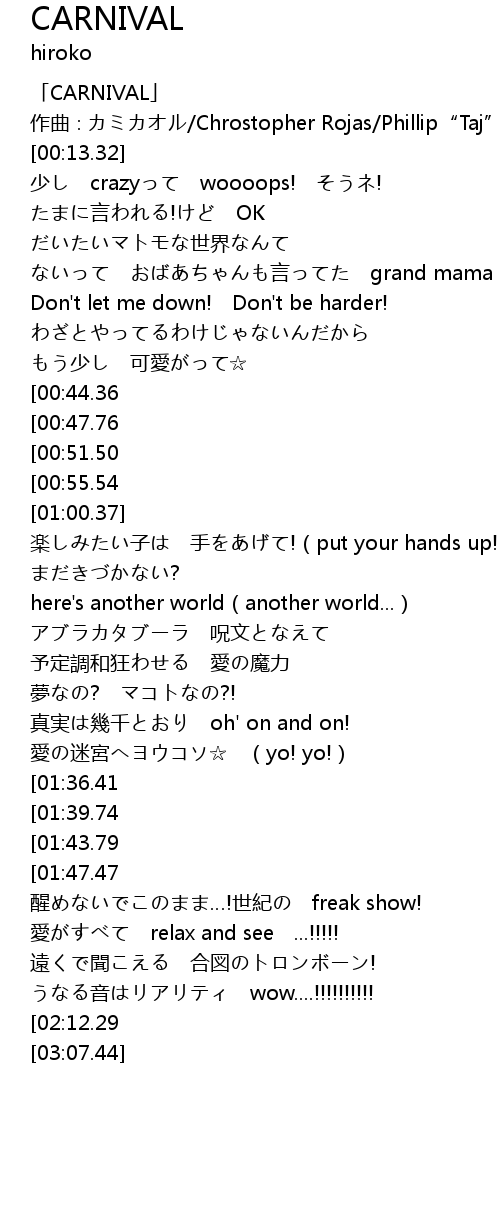 | [02:59.45][01:47.47] | shi! CARNIVAL! |