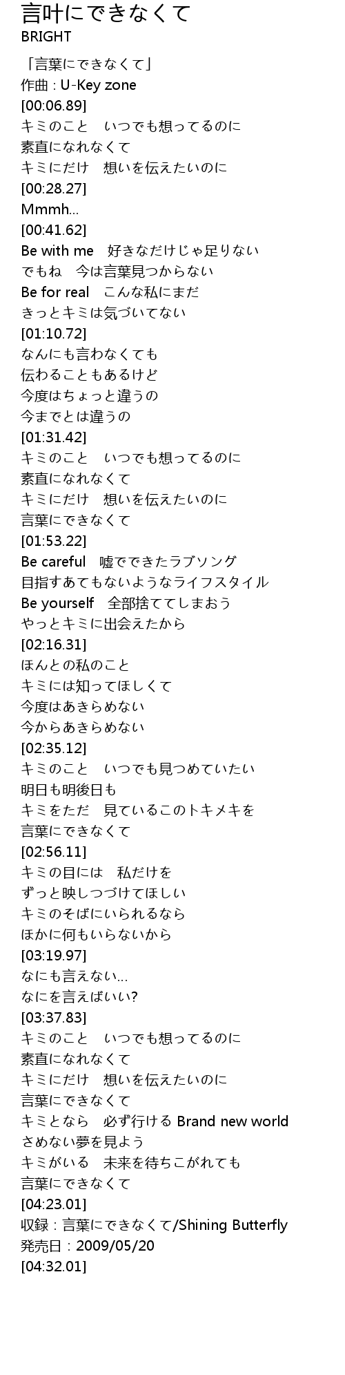| [04:26.01] | 収録:言葉にできなくて/Shining Butterfly |