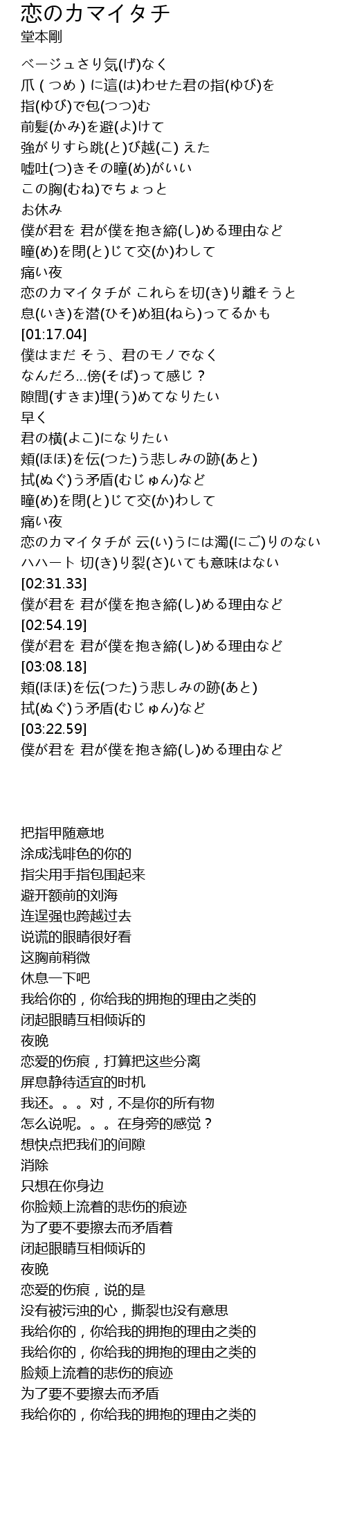 | [01:04.74] | 恋のカマイタチが これらを切(き)り離そうと |
