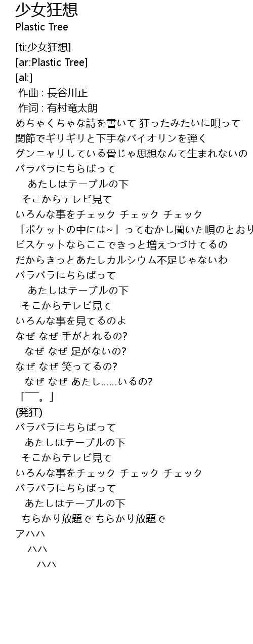 | [00:27.24] | めちゃくちゃな詩を書いて 狂ったみたいに唄って |