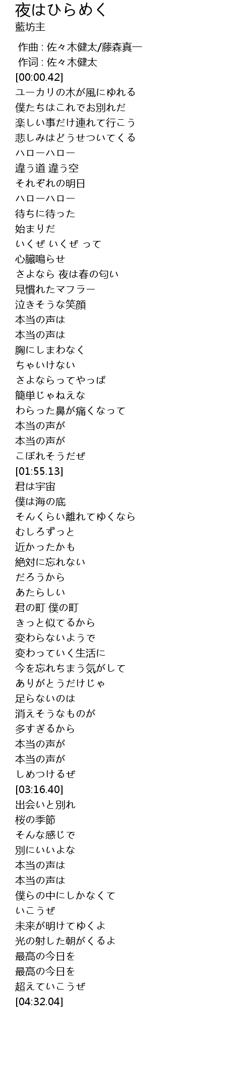 | [00:00.00] | 作曲 : 佐々木健太/藤森真一 |