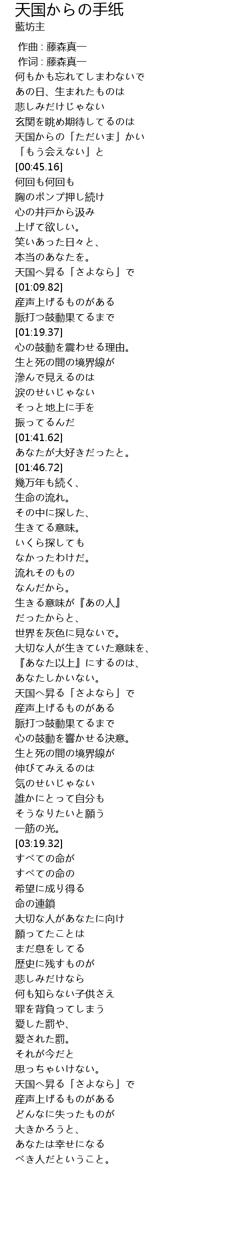 | [01:05.17] | 天国へ昇る「さよなら」で |