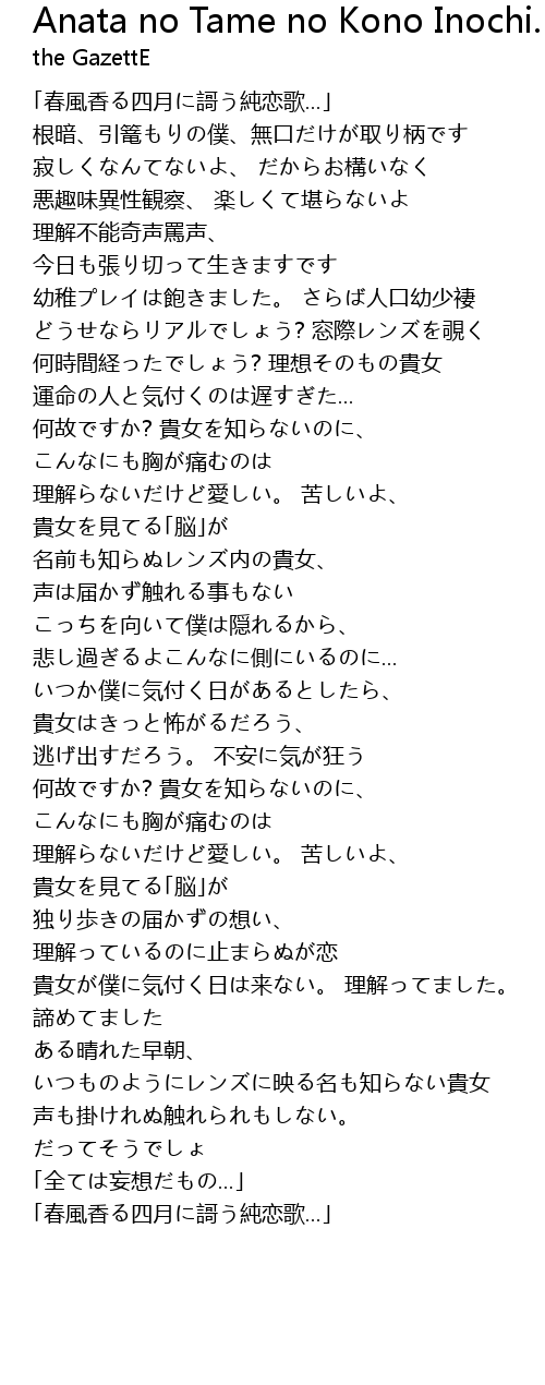 | [03:47.000] | 理解らないだけど愛しい。 苦しいよ、 貴女を見てる「脳」が |