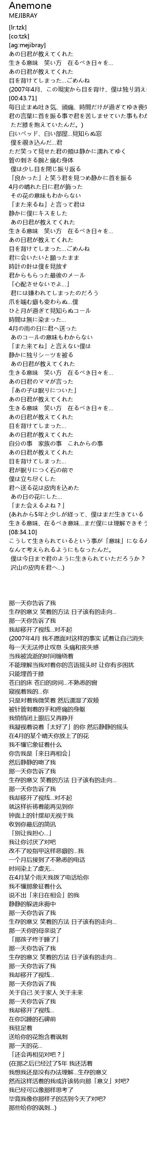 | [00:43.71] | 毎日止まぬ吐き気、頭痛、時間だけが過ぎてゆき喪失感が纏わりついた |
