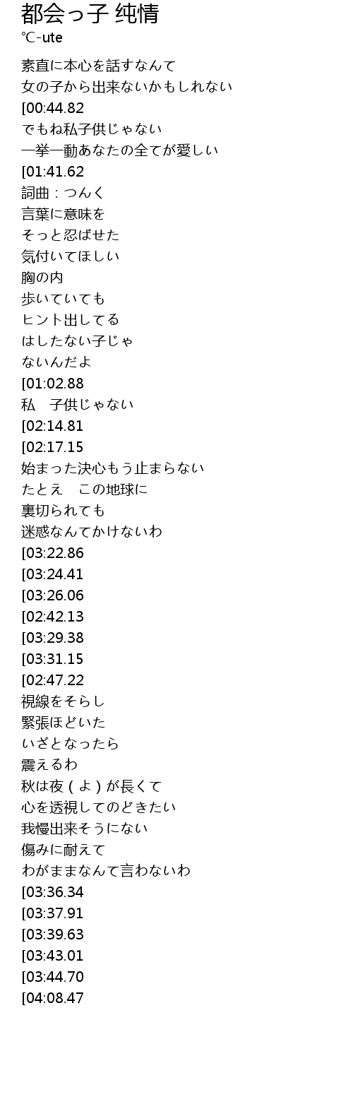 | [00:17.98][01:41.62][02:54.29][03:53.47][04:14.79] | ℃-ute-都会っ子 純情 |