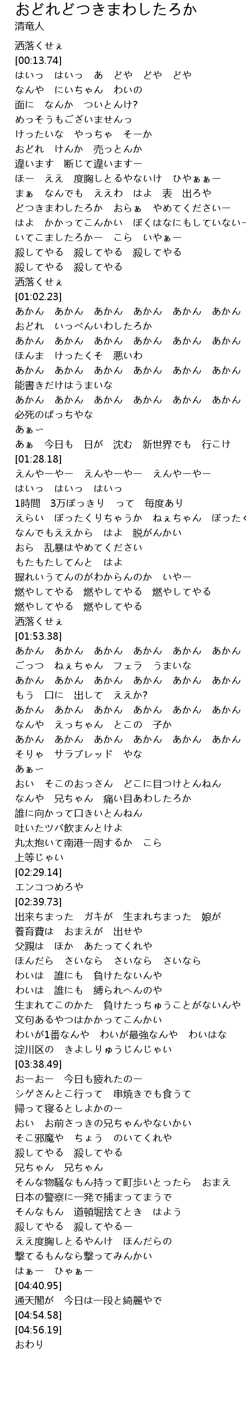 | [00:55.33] | いてこましたろかー こら いやぁー |