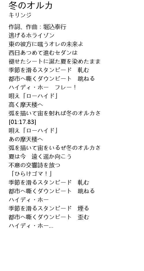 | [01:11.24] | 弧を描いて宙を射れば冬のオルカさ |