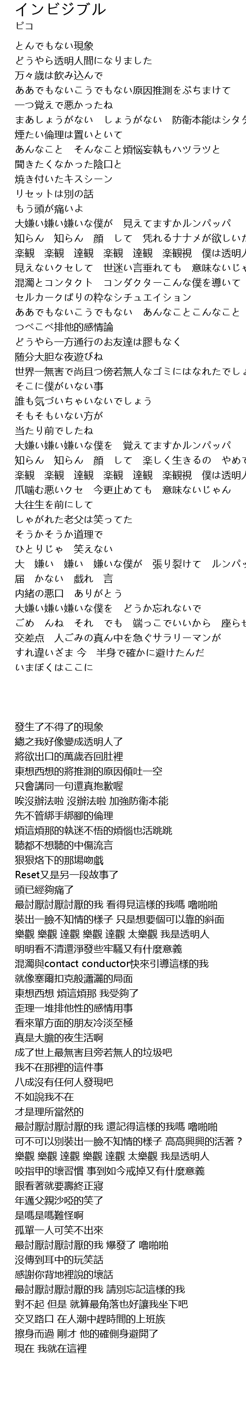 | [01:55.19] | 楽観 楽観 達観 楽観 達観 楽観視 僕は透明人間 |