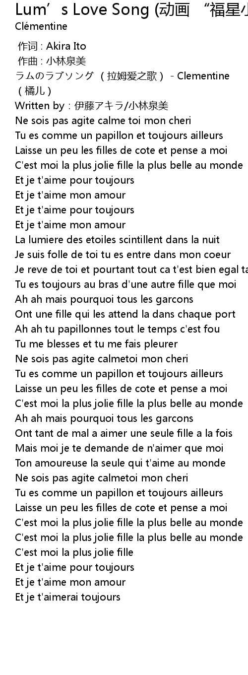 | [00:00.10] | ラムのラブソング (拉姆爱之歌) - Clementine (橘儿) |