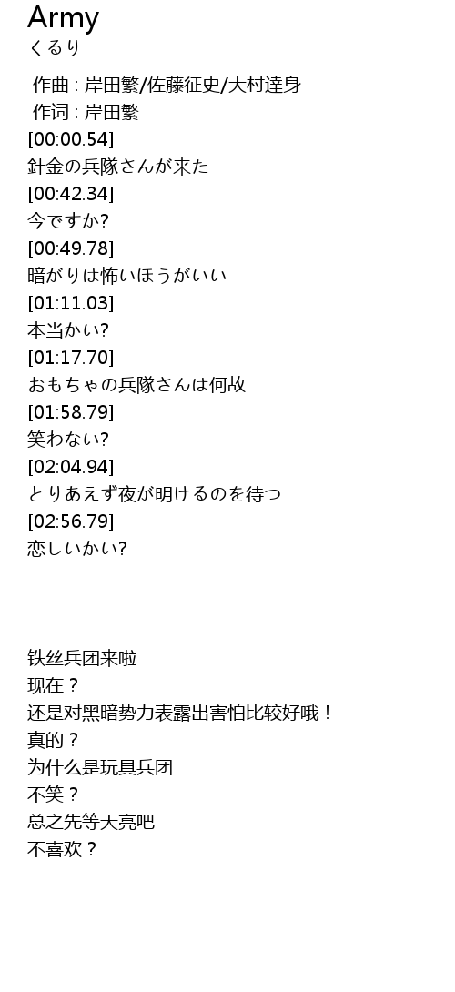 | [00:30.43] | 針金の兵隊さんが来た |