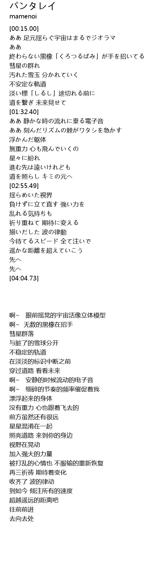 | [00:34.80] | ああ 足元揺らぐ宇宙はまるでジオラマ |