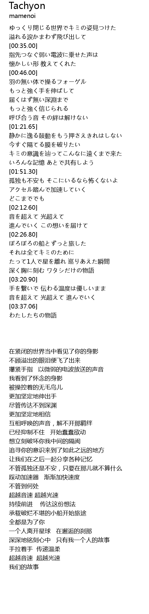 | [03:29.10] | 音を超えて 光超えて 進んでいく |