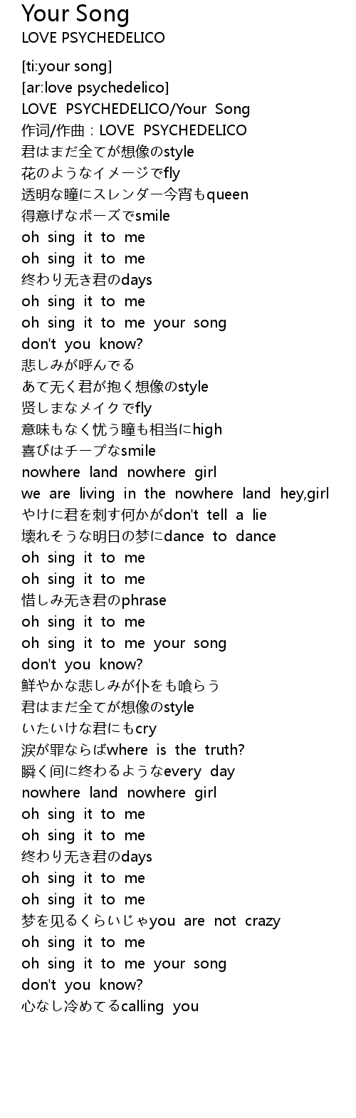 | [00:01.169] | LOVE PSYCHEDELICO/Your Song |