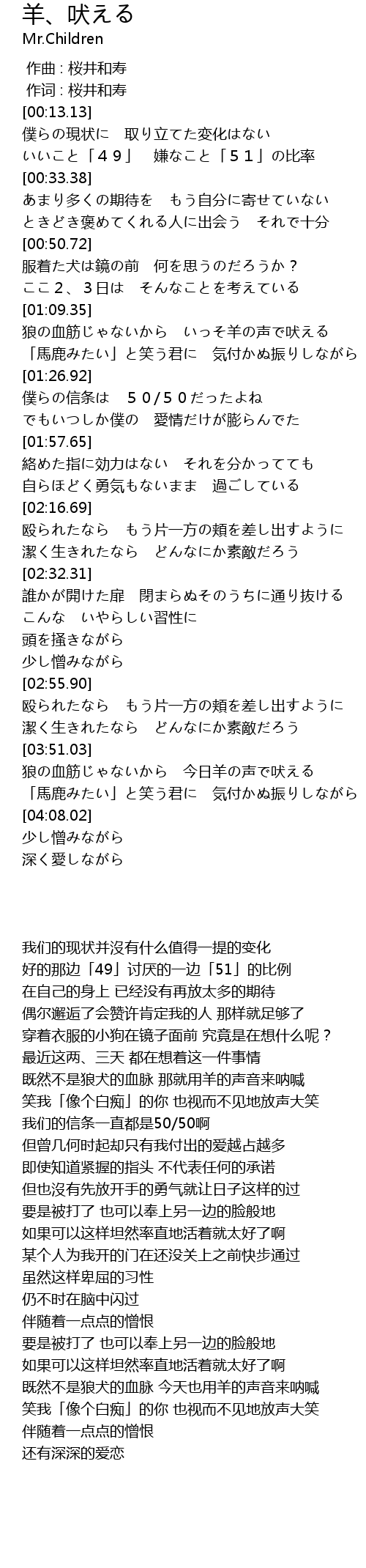 | [03:53.03] | 狼の血筋じゃないから 今日羊の声で吠える |
