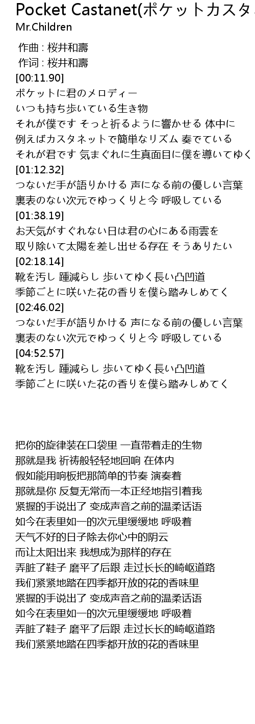 | [00:16.90] | ポケットに君のメロディー いつも持ち歩いている生き物 |