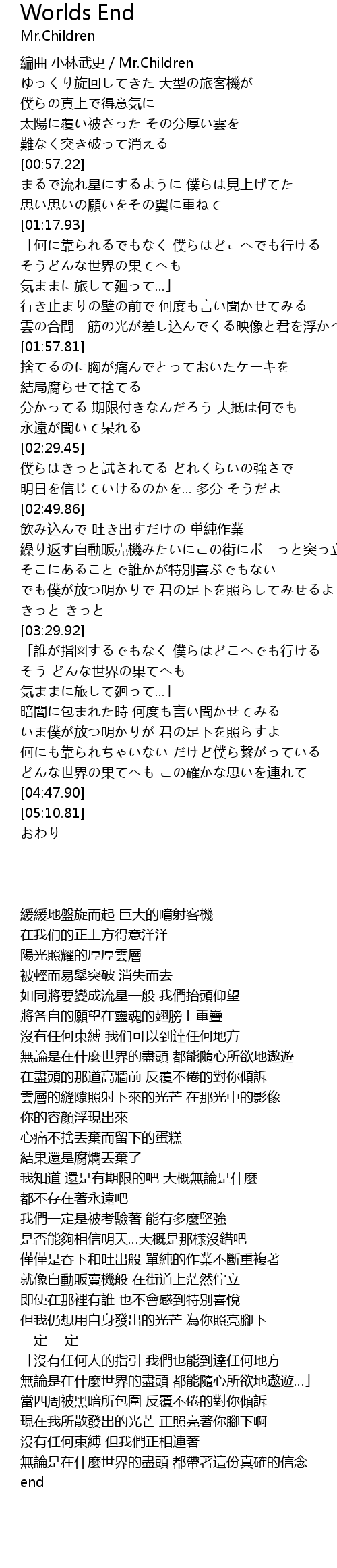 | [00:24.34] | 編曲 小林武史/Mr.Children |