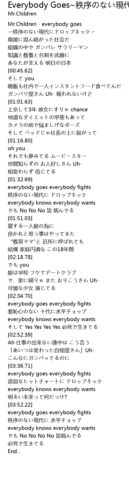 | [00:00.00] | Mr.Children - everybody goes 〜秩序のない現代にドロップキック〜 |