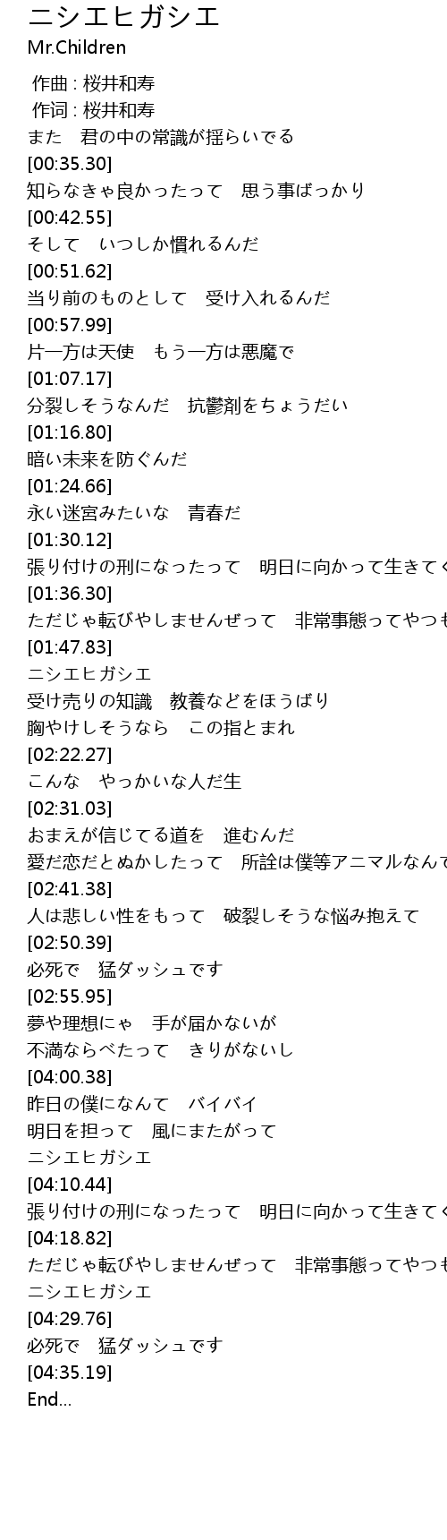 | [04:27.57] | ニシエヒガシエ |