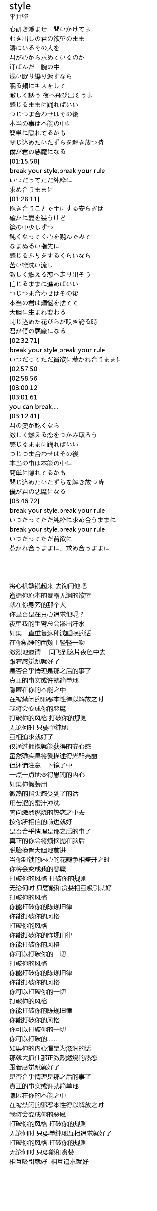 | [03:06.28][03:00.12][02:54.02][02:47.94] | you can break your style |