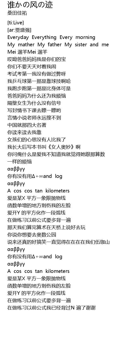 | [00:47.757] | nǐ wèn ǎn shén me shì ài wǒ bù zhī dào wǒ jiù jué de tā gēn nà suàn shù |