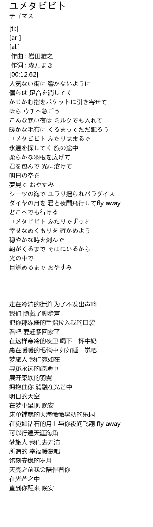 | [01:03.87] | ユメタビビト ふたりはまるで |