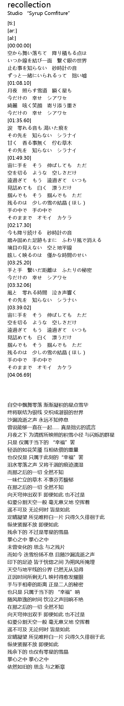 | [03:56.07] | 残るのは 少しの雪の結晶(ほし) |