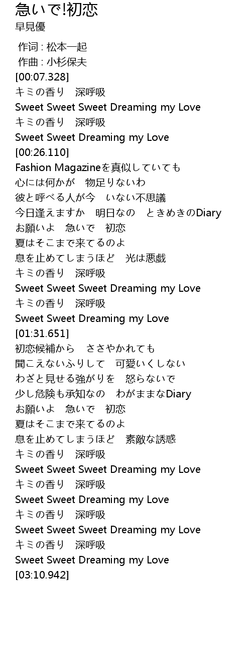| [01:00.957] | お願いよ 急いで 初恋 |
