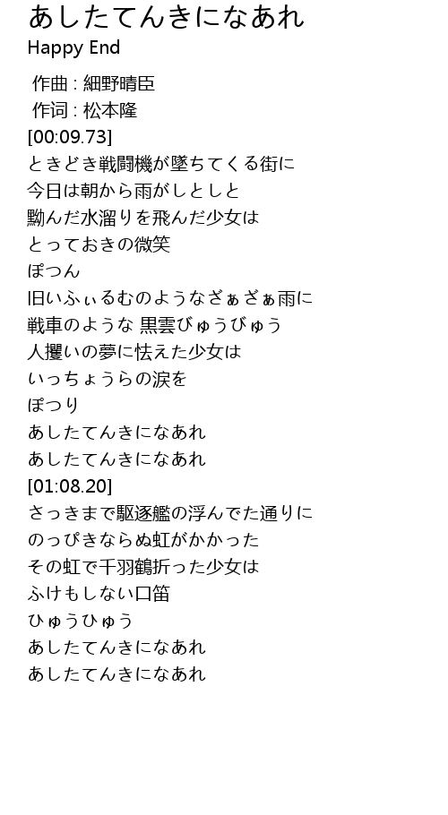 | [00:11.17] | ときどき戦闘機が墜ちてくる街に |