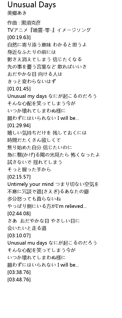 | [01:02.08] | Unusual my days なにが起こるのだろう |