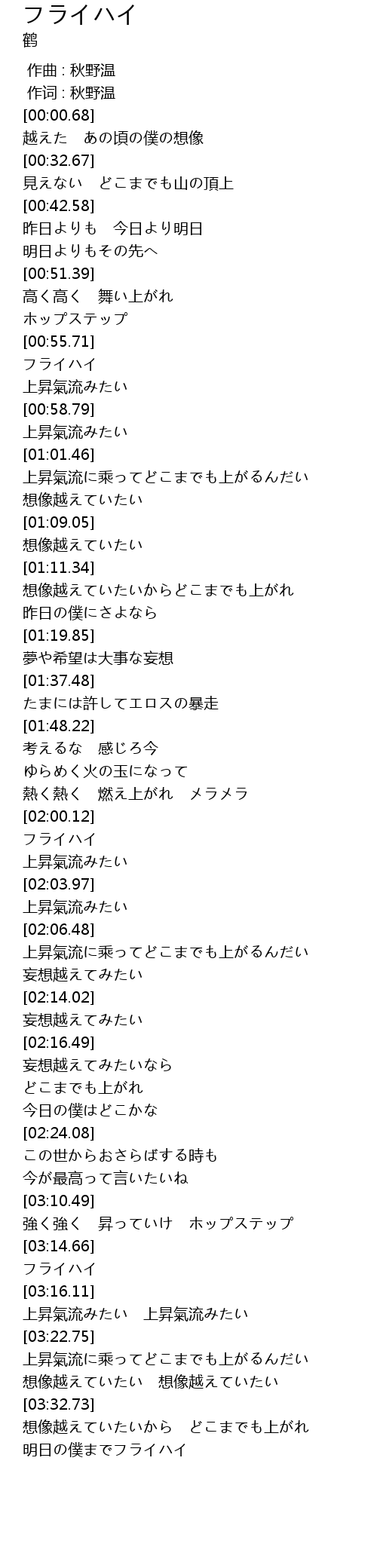 | [01:02.16] | 上昇氣流に乘ってどこまでも上がるんだい |