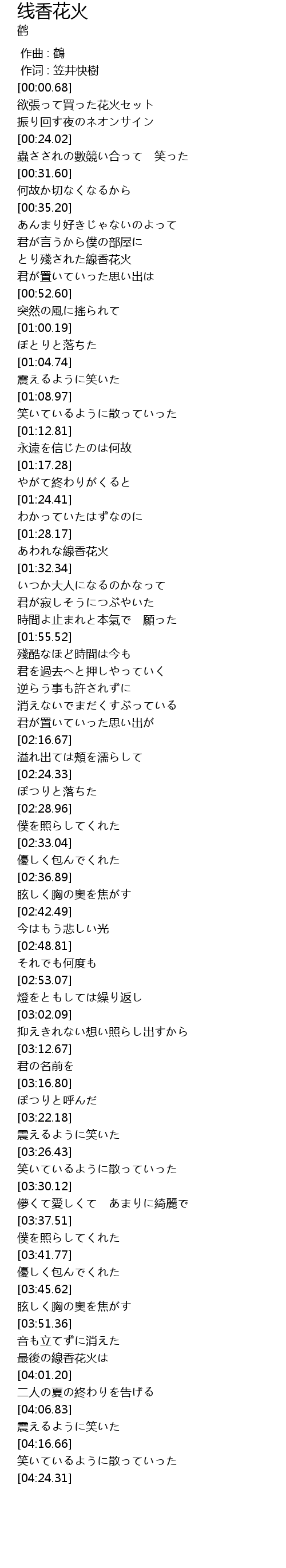 | [00:43.37] | cán xiàn xiāng huā huǒ |