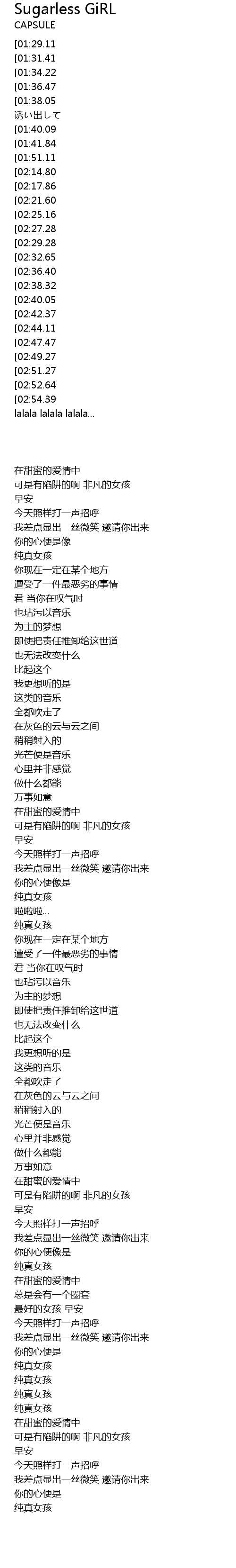 | [00:28.04][01:41.84][01:57.55][03:11.02][03:25.67][03:31.73][03:35.47][03:39.09][03:55.50] | シュガーレスガール |