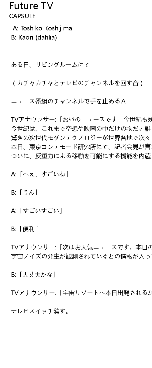 | TVアナウンサー:「宇宙リゾートへ本日出発されるかたはご注意くださ…」 | |