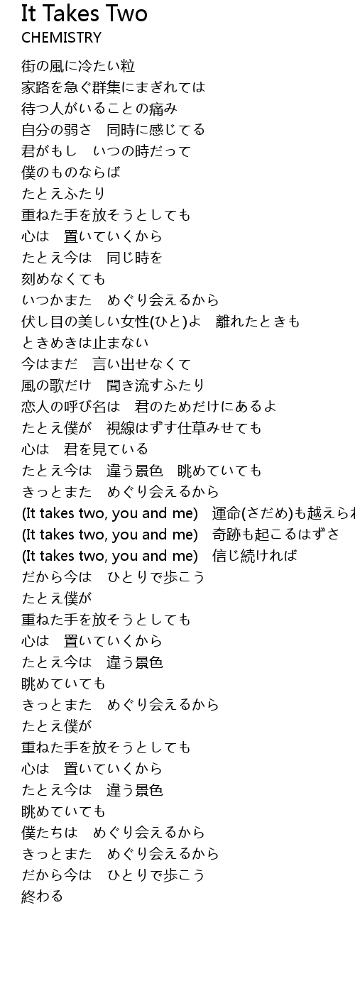 | [02:24.20] | (It takes two, you and me) 奇跡も起こるはずさ |