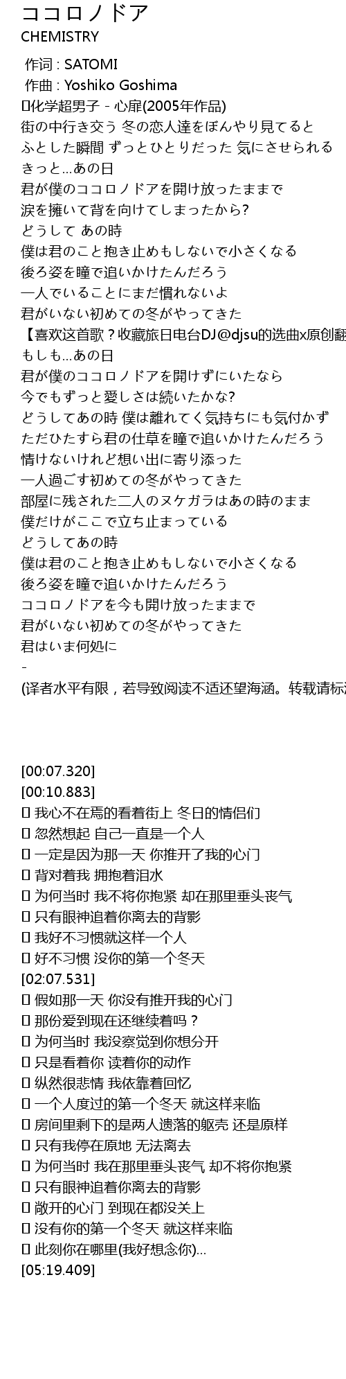 | [00:07.320] | ♪化学超男子 - 心扉(2005年作品) |