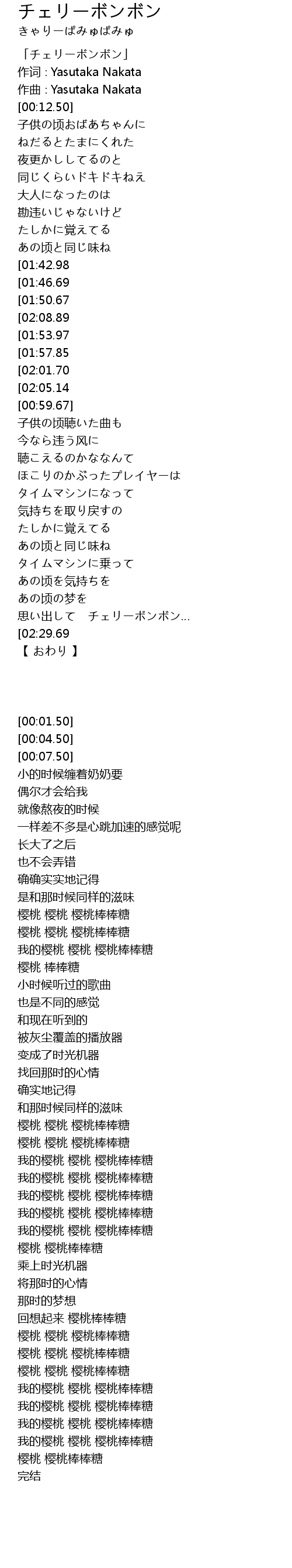 | [02:56.79][01:57.85] | チェリー チェリー チェリーボンボン |