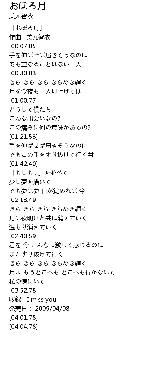 | [03:36.68] | 月よ もうどこへも どこへも行かないで |